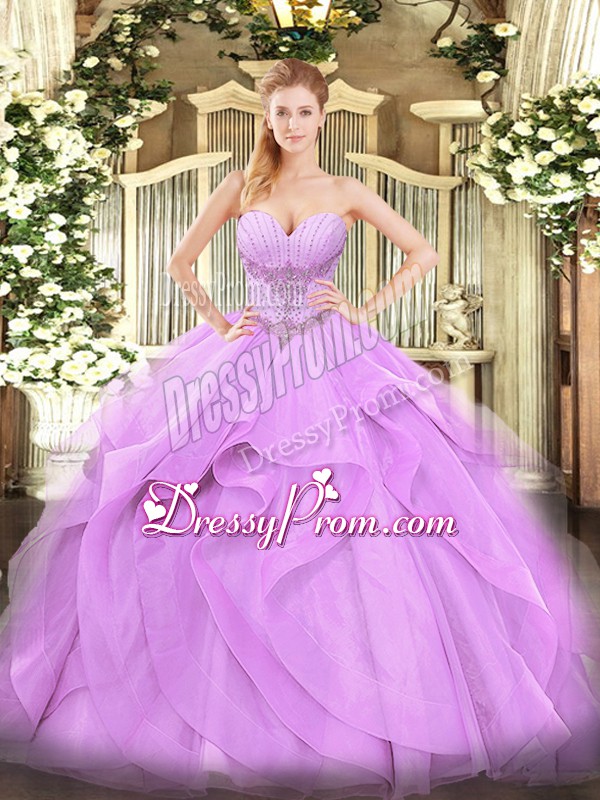 Neckline : SweetheartShown Color : LavenderSilhouette : Ball GownsSleeve Length : sleevelessHemline : floor lengthBack Detail : Lace upFabric : TulleEmbellishment : Beading,RufflesOccasion : Military Ball,Sweet 16,QuinceaneraSeason : Spring,Summer,Fall,Winter