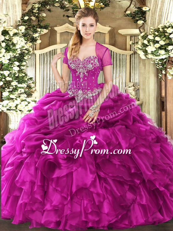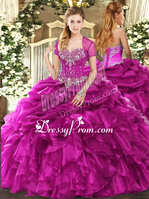 Neckline : SweetheartShown Color : FuchsiaSilhouette : Ball GownsSleeve Length : sleevelessHemline : floor lengthBack Detail : Lace upFabric : OrganzaEmbellishment : Beading,Ruffles,Pick UpsOccasion : Military Ball,Sweet 16,QuinceaneraSeason : Spring,Summer,Fall,Winter