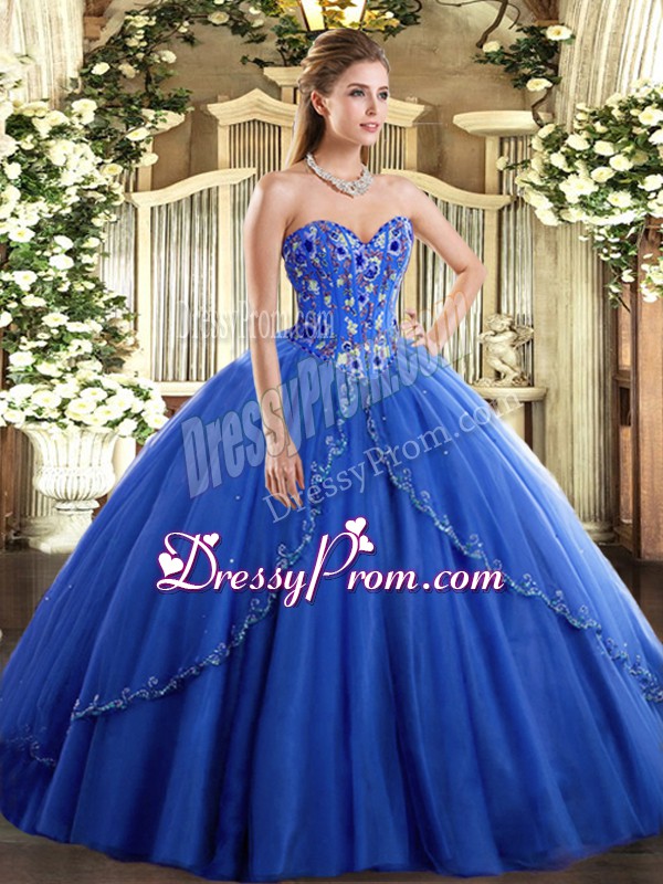Neckline : SweetheartShown Color : BlueSilhouette : Ball GownsSleeve Length : sleevelessBack Detail : Lace upFabric : TulleEmbellishment : Appliques,EmbroideryOccasion : Military Ball,Sweet 16,QuinceaneraSeason : Spring,Summer,Fall,Winter