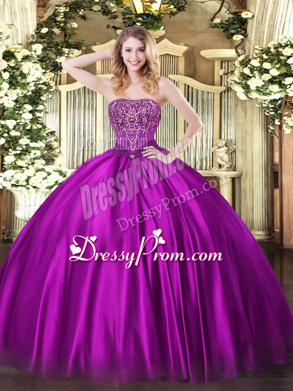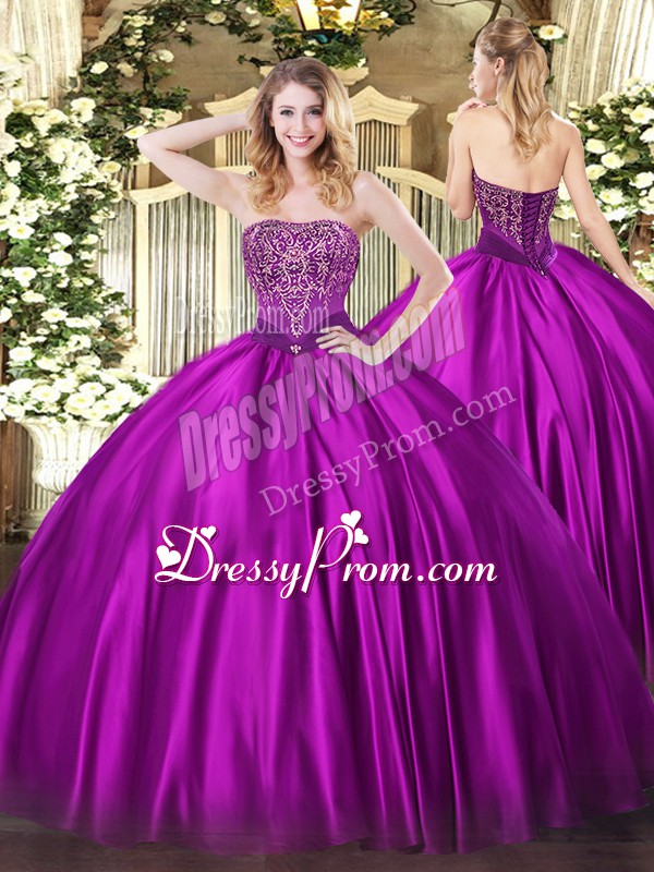 Neckline : StraplessShown Color : FuchsiaSilhouette : Ball GownsSleeve Length : sleevelessHemline : floor lengthBack Detail : Lace upFabric : SatinEmbellishment : BeadingOccasion : Military Ball,Sweet 16,QuinceaneraSeason : Spring,Summer,Fall,Winter