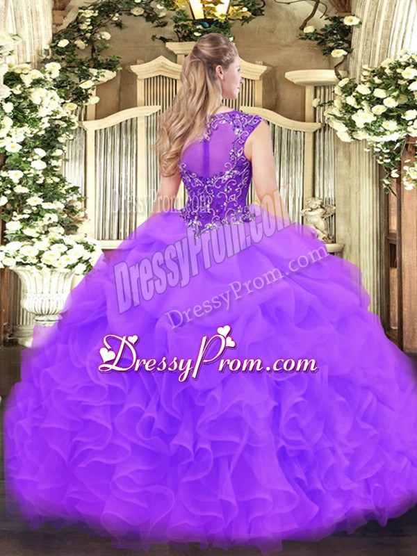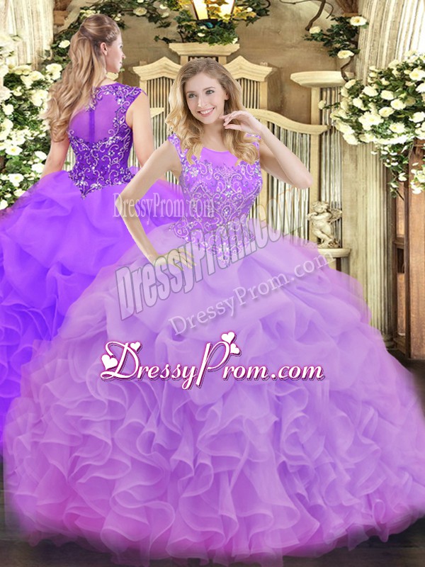 Neckline : ScoopShown Color : LavenderSilhouette : Ball GownsSleeve Length : sleevelessHemline : floor lengthBack Detail : ZipperFabric : OrganzaEmbellishment : Beading,Ruffles,Pick UpsOccasion : Military Ball,Sweet 16,QuinceaneraSeason : Spring,Summer,Fall,Winter