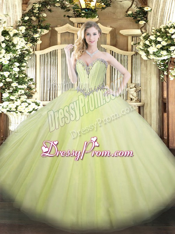 Neckline : SweetheartShown Color : Yellow GreenSilhouette : Ball GownsSleeve Length : sleevelessHemline : floor lengthBack Detail : Lace upFabric : TulleEmbellishment : BeadingOccasion : Military Ball,Sweet 16,QuinceaneraSeason : Spring,Summer,Fall,Winter
