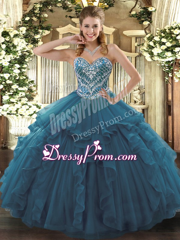 Neckline : SweetheartShown Color : Teal Silhouette : Ball GownsSleeve Length : sleevelessHemline : floor lengthBack Detail : Lace upFabric : TulleEmbellishment : Beading,RufflesOccasion : Military Ball,Sweet 16,QuinceaneraSeason : Spring,Summer,Fall,Winter