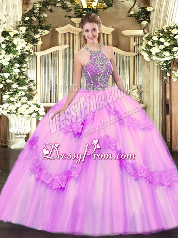 Neckline : Halter topShown Color : LilacSilhouette : Ball GownsSleeve Length : sleevelessHemline : floor lengthBack Detail : Lace upFabric : TulleEmbellishment : Beading,AppliquesOccasion : Military Ball,Sweet 16,QuinceaneraSeason : Spring,Summer,Fall,Winter