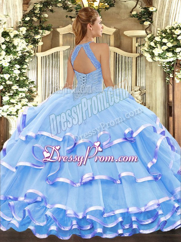 Neckline : Halter topShown Color : LavenderSilhouette : Ball GownsSleeve Length : sleevelessHemline : floor lengthBack Detail : Lace upFabric : OrganzaEmbellishment : Beading,Ruffled LayersOccasion : Military Ball,Sweet 16,QuinceaneraSeason : Spring,Summer,Fall,Winter