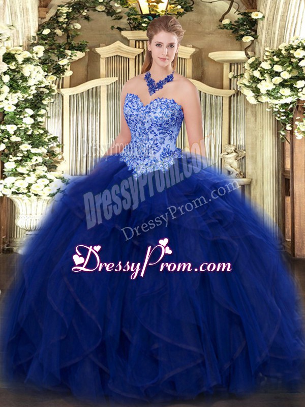 Neckline : SweetheartShown Color : BlueSilhouette : Ball GownsSleeve Length : sleevelessHemline : floor lengthBack Detail : Lace upFabric : OrganzaEmbellishment : Appliques,RufflesOccasion : Military Ball,Sweet 16,QuinceaneraSeason : Spring,Summer,Fall,Winter