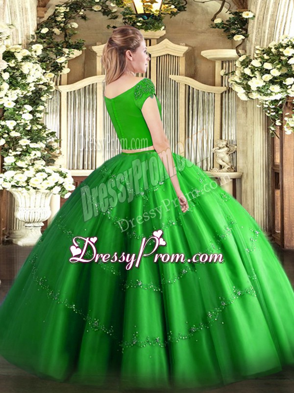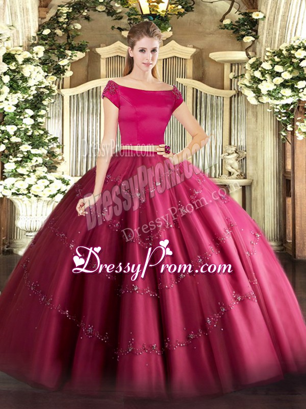 Neckline : Off the shoulder Shown Color : Hot Pink Silhouette : Two Pieces Sleeve Length : short sleeves Hemline : floor length Back Detail : Zipper Fabric : Tulle Embellishment : Appliques Occasion : Military Ball,Sweet 16,Quinceanera Season : Spring,Summer,Fall,Winter