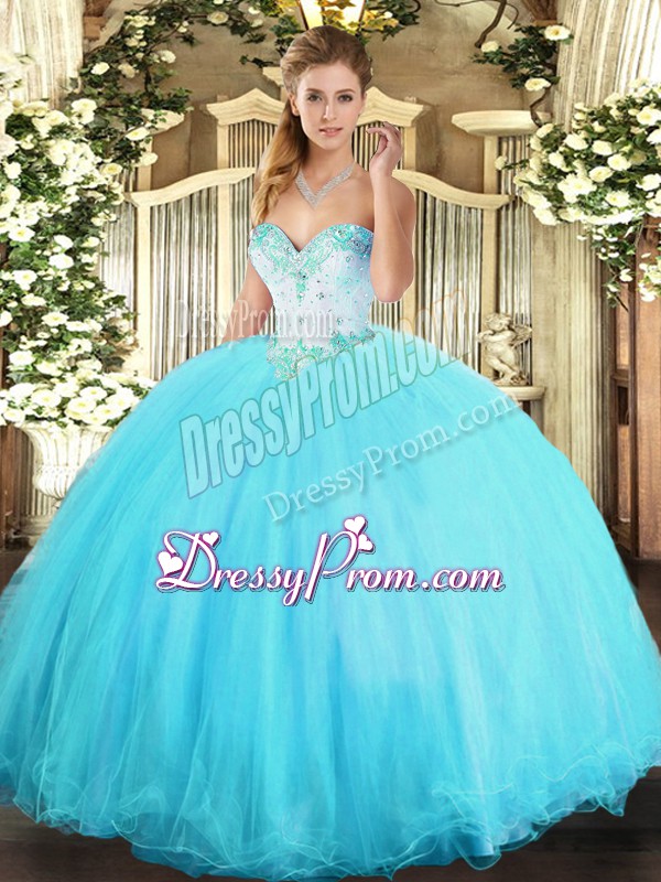 Luxurious Sleeveless Floor Length Beading Lace Up Sweet 16 Dress with Aqua Blue
