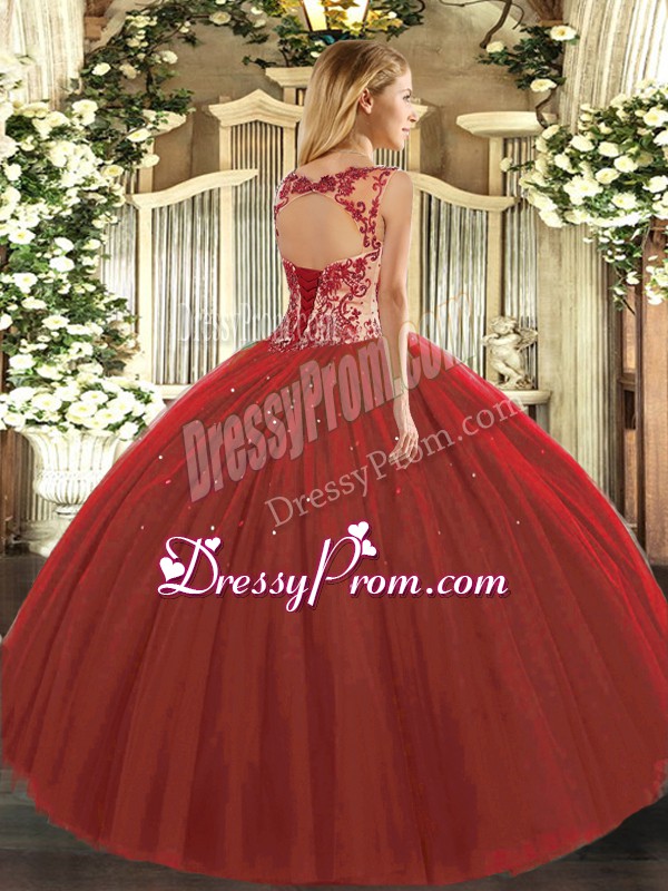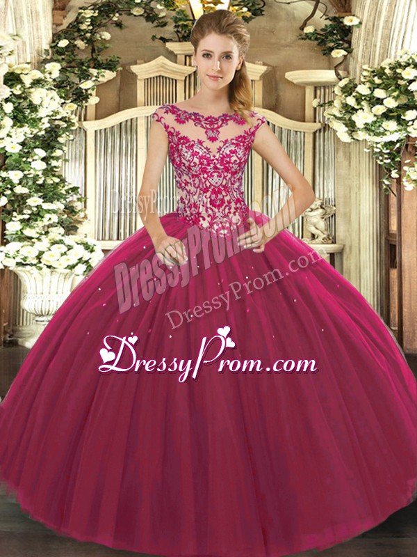 Neckline : ScoopShown Color : FuchsiaSilhouette : Ball GownsSleeve Length : cap sleevesHemline : floor lengthBack Detail : Lace upFabric : TulleEmbellishment : Beading,AppliquesOccasion : Sweet 16,QuinceaneraSeason : Spring,Summer,Fall,Winter