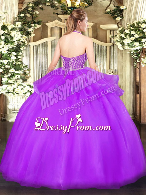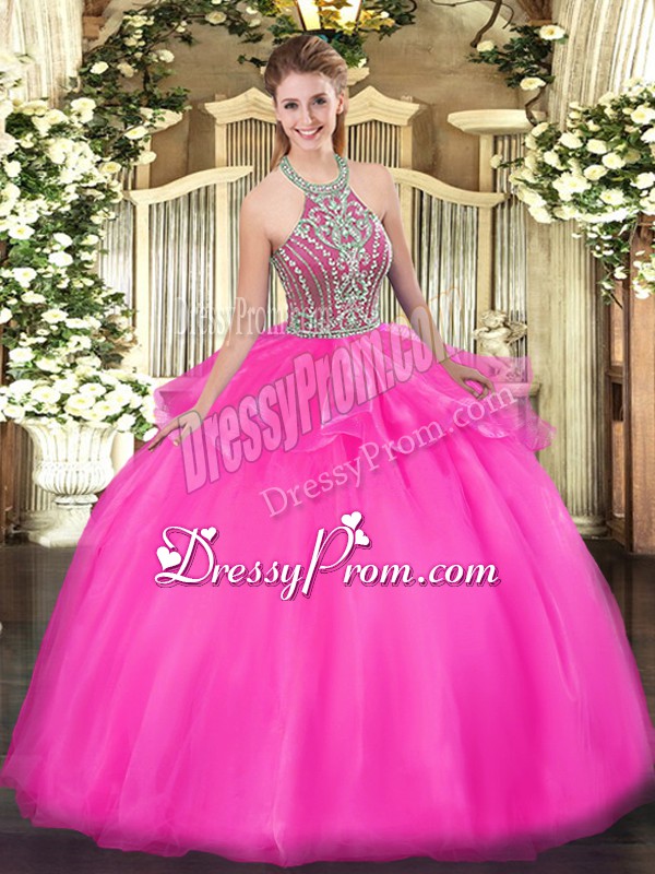 Neckline : Halter topShown Color : Hot PinkSilhouette : Ball GownsSleeve Length : sleevelessHemline : floor lengthBack Detail : Lace upFabric : TulleEmbellishment : Beading,RufflesOccasion : Military Ball,Sweet 16,QuinceaneraSeason : Spring,Summer,Fall,Winter