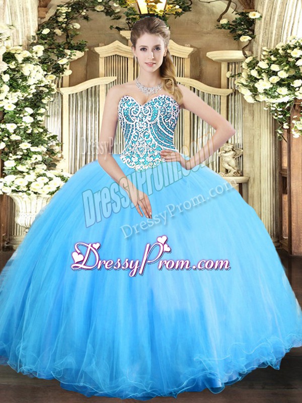 Neckline : SweetheartShown Color : Aqua BlueSilhouette : Ball GownsSleeve Length : sleevelessHemline : floor lengthBack Detail : Lace upFabric : TulleEmbellishment : BeadingOccasion : Military Ball,Sweet 16,QuinceaneraSeason : Spring,Summer,Fall,Winter