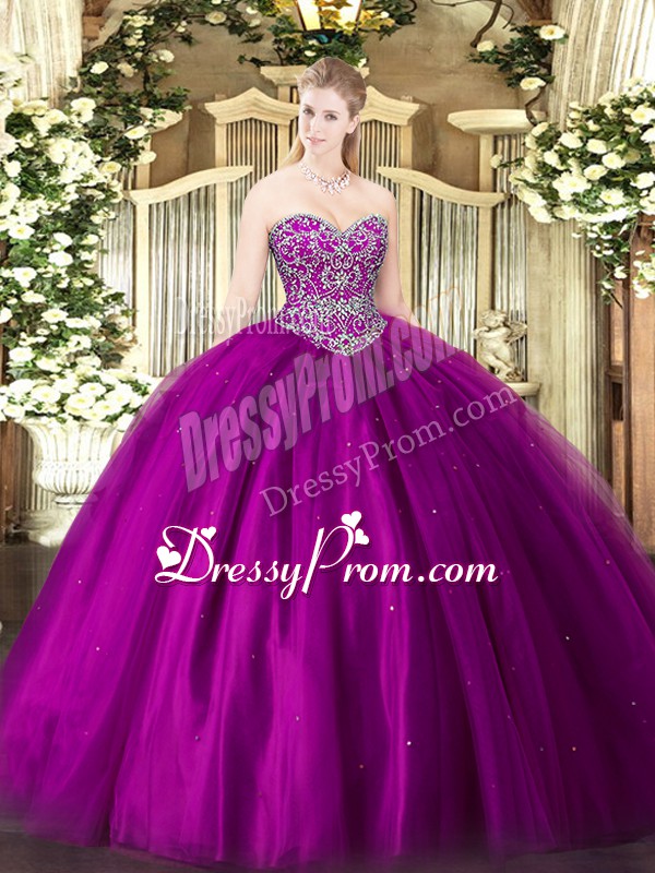 Neckline : SweetheartShown Color : FuchsiaSilhouette : Ball GownsSleeve Length : sleevelessHemline : floor lengthBack Detail : Lace upFabric : TulleEmbellishment : BeadingOccasion : Military Ball,Sweet 16,QuinceaneraSeason : Spring,Summer,Fall,Winter