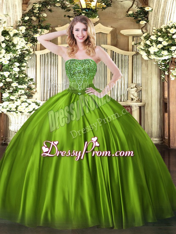 Neckline : StraplessShown Color : Olive GreenSilhouette : Ball GownsSleeve Length : sleevelessHemline : floor lengthBack Detail : Lace upFabric : SatinEmbellishment : BeadingOccasion : Military Ball,Sweet 16,QuinceaneraSeason : Spring,Summer,Fall,Winter