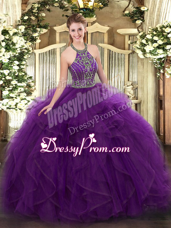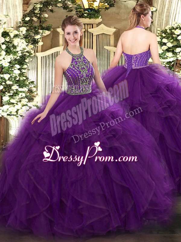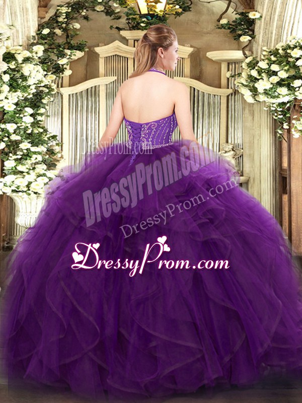 Neckline : Halter topShown Color : PurpleSilhouette : Ball GownsSleeve Length : sleevelessHemline : floor lengthBack Detail : Lace upFabric : TulleEmbellishment : Beading,RufflesOccasion : Military Ball,Sweet 16,QuinceaneraSeason : Spring,Summer,Fall,Winter