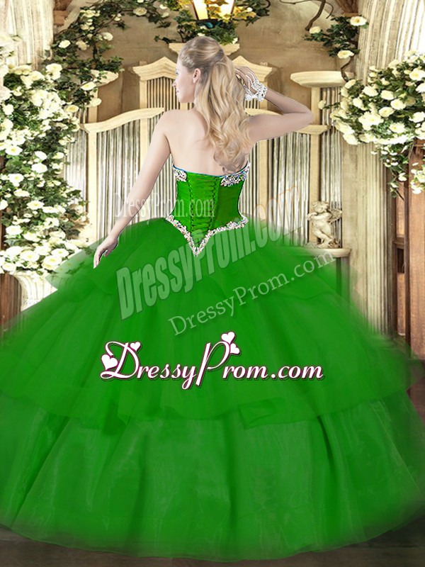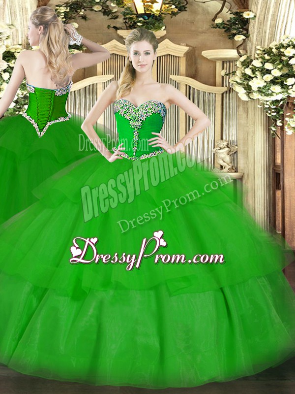 Neckline : SweetheartShown Color : GreenSilhouette : Ball GownsSleeve Length : sleevelessHemline : floor lengthBack Detail : Lace upFabric : TulleEmbellishment : Beading,Ruffled LayersOccasion : Military Ball,Sweet 16,QuinceaneraSeason : Spring,Summer,Fall,Winter
