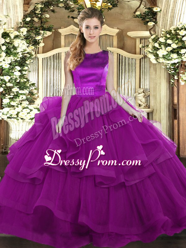 Neckline : ScoopShown Color : PurpleSilhouette : Ball GownsSleeve Length : sleevelessHemline : floor lengthBack Detail : Lace upFabric : TulleEmbellishment : RufflesOccasion : Military Ball,Sweet 16,QuinceaneraSeason : Spring,Summer,Fall,Winter