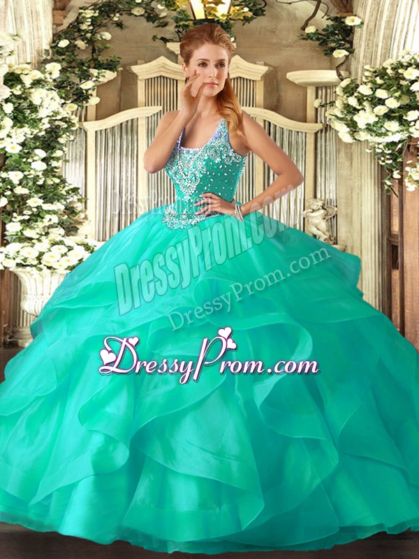 Neckline : StrapsShown Color : TurquoiseSilhouette : Ball GownsSleeve Length : sleevelessHemline : floor lengthBack Detail : Lace upFabric : TulleEmbellishment : Beading,RufflesOccasion : Military Ball,Sweet 16,QuinceaneraSeason : Spring,Summer,Fall,Winter