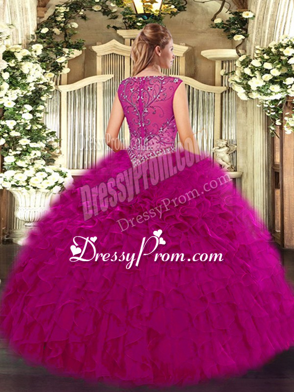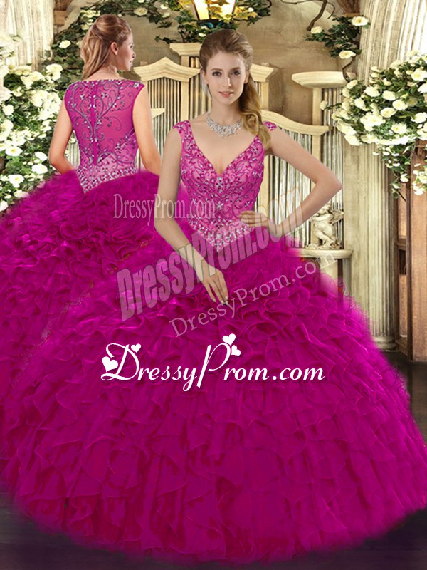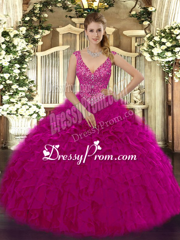 Neckline : V-neckShown Color : FuchsiaSilhouette : Ball GownsSleeve Length : sleevelessHemline : floor lengthBack Detail : ZipperFabric : OrganzaEmbellishment : Beading,RufflesOccasion : Military Ball,Sweet 16,QuinceaneraSeason : Spring,Summer,Fall,Winter