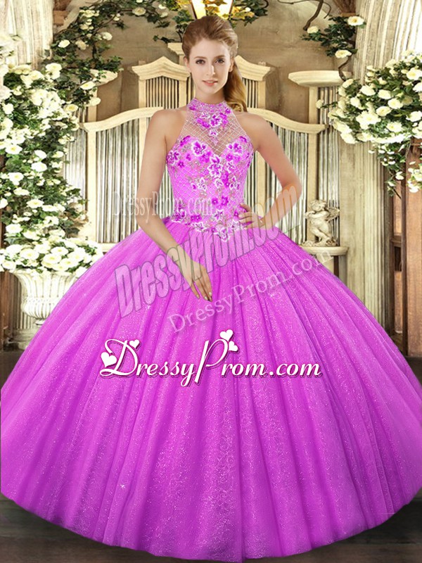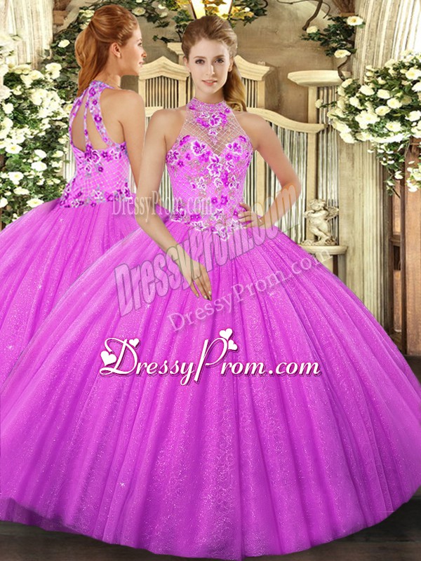Neckline : Halter topShown Color : FuchsiaSilhouette : Ball GownsSleeve Length : sleevelessHemline : floor lengthBack Detail : Lace upFabric : TulleEmbellishment : Beading,EmbroideryOccasion : Military Ball,Sweet 16,QuinceaneraSeason : Spring,Summer,Fall,Winter
