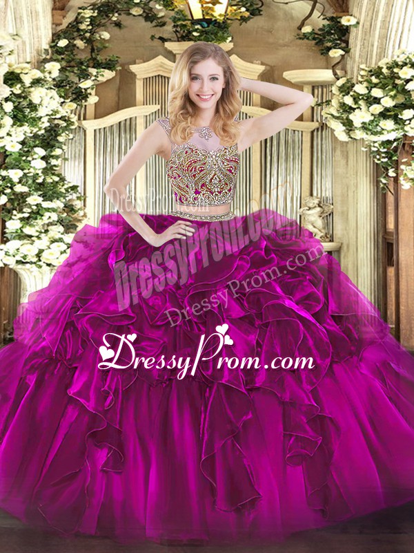 Neckline : ScoopShown Color : FuchsiaSilhouette : Two PiecesSleeve Length : sleevelessHemline : floor lengthBack Detail : Lace upFabric : OrganzaEmbellishment : Beading,RufflesOccasion : Military Ball,Sweet 16,QuinceaneraSeason : Spring,Summer,Fall,Winter