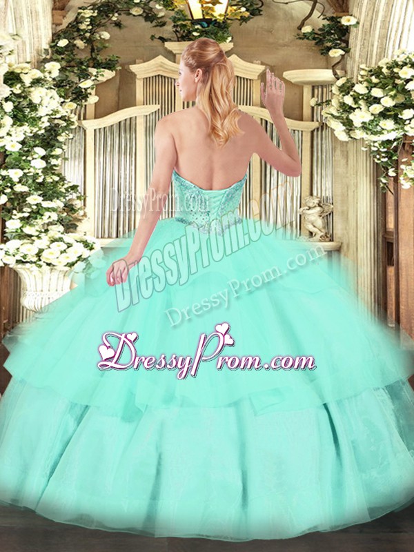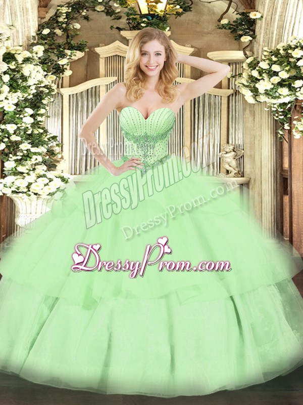 Neckline : SweetheartShown Color : Yellow GreenSilhouette : Ball GownsSleeve Length : sleevelessHemline : floor lengthBack Detail : Lace upFabric : TulleEmbellishment : Beading,Ruffled LayersOccasion : Military Ball,Sweet 16,QuinceaneraSeason : Spring,Summer,Fall,Winter