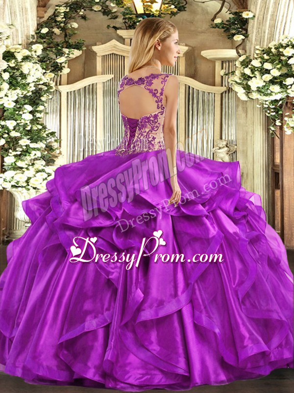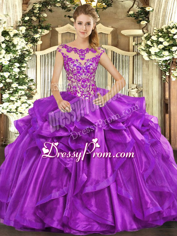 Neckline : ScoopShown Color : Eggplant PurpleSilhouette : Ball GownsSleeve Length : cap sleevesHemline : floor lengthBack Detail : Lace upFabric : OrganzaEmbellishment : Appliques,RufflesOccasion : Sweet 16,QuinceaneraSeason : Spring,Summer,Fall,Winter
