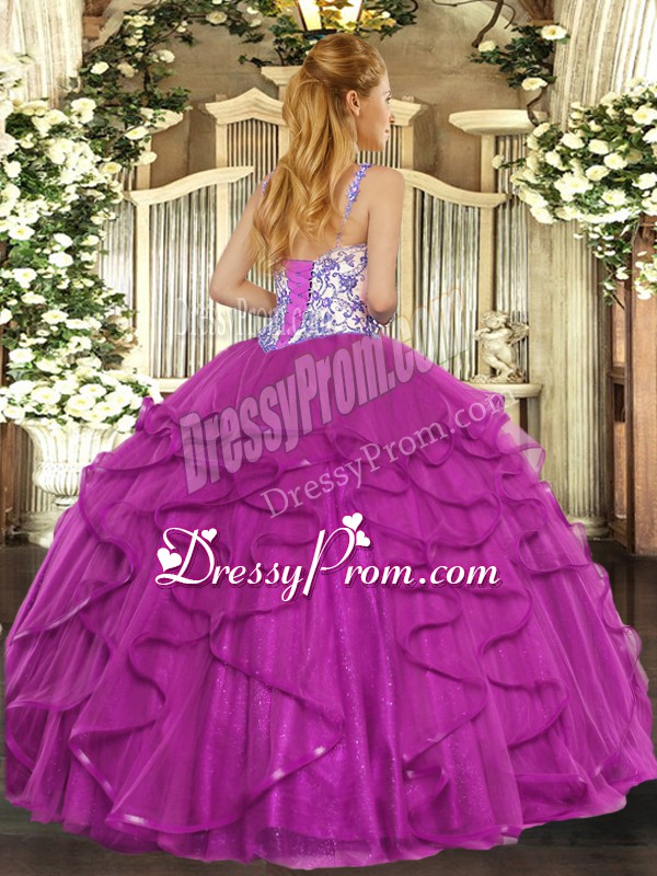 Neckline : StrapsShown Color : Teal Silhouette : Ball GownsSleeve Length : sleevelessHemline : floor lengthBack Detail : Lace upFabric : TulleEmbellishment : Beading,RufflesOccasion : Sweet 16,QuinceaneraSeason : Spring,Summer,Fall,Winter