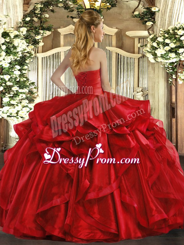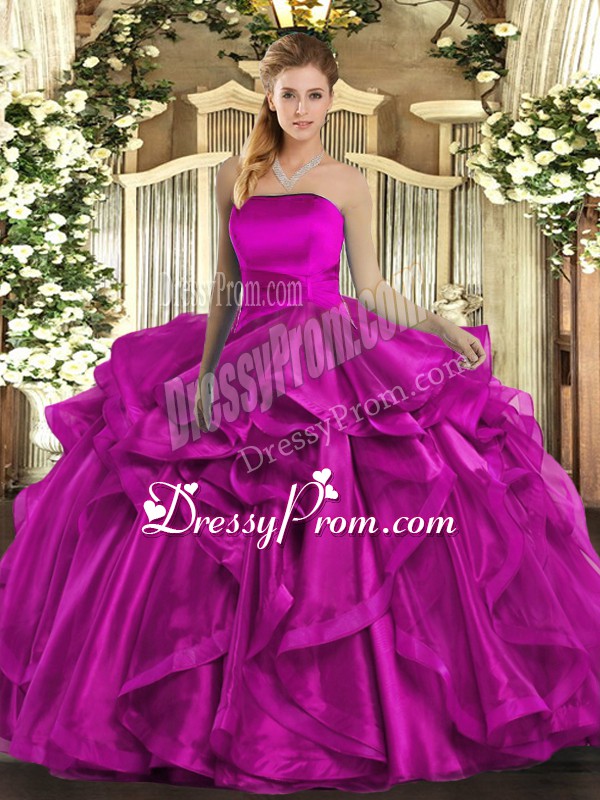 Neckline : StraplessShown Color : FuchsiaSilhouette : Ball GownsSleeve Length : sleevelessHemline : floor lengthBack Detail : Lace upFabric : OrganzaEmbellishment : RufflesOccasion : Military Ball,Sweet 16,QuinceaneraSeason : Spring,Summer,Fall,Winter