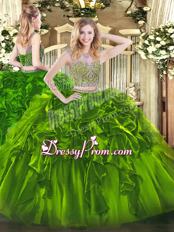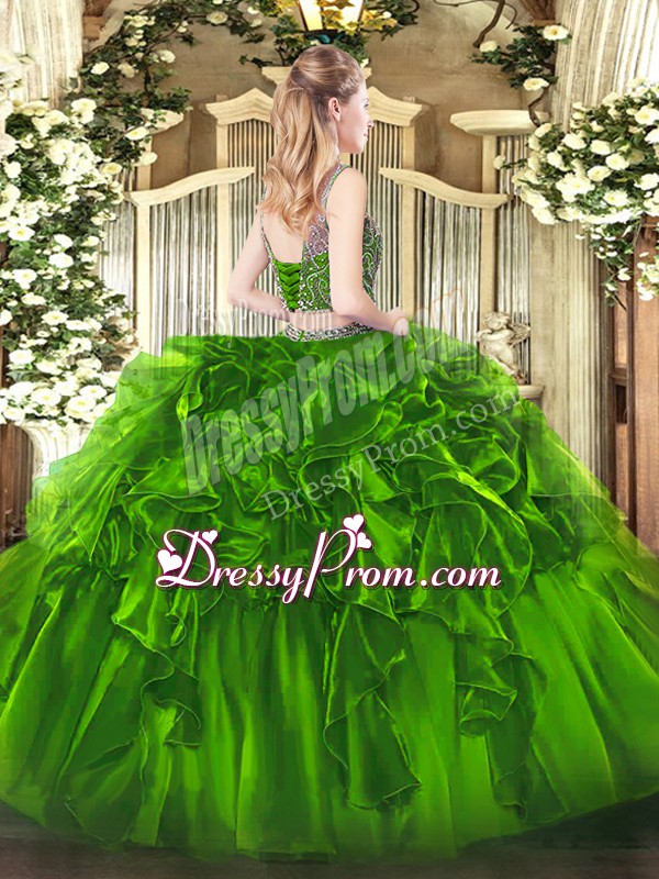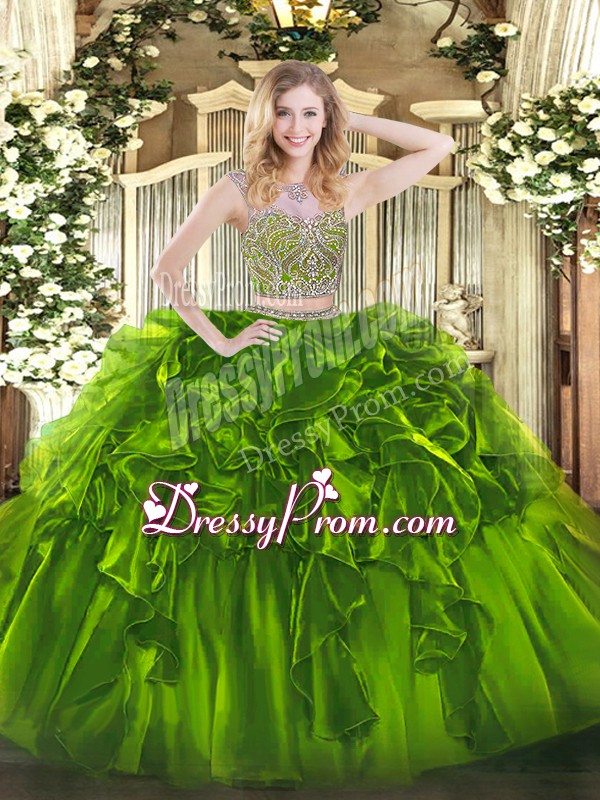 Neckline : ScoopShown Color : Olive GreenSilhouette : Two PiecesSleeve Length : sleevelessHemline : floor lengthBack Detail : Lace upFabric : OrganzaEmbellishment : Beading,RufflesOccasion : Military Ball,Sweet 16,QuinceaneraSeason : Spring,Summer,Fall,Winter