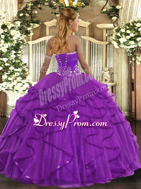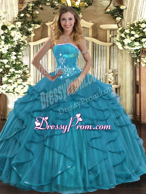 Neckline : StraplessShown Color : Teal Silhouette : Ball GownsSleeve Length : sleevelessHemline : floor lengthBack Detail : Lace upFabric : TulleEmbellishment : Beading,RufflesOccasion : Military Ball,Sweet 16,QuinceaneraSeason : Spring,Summer,Fall,Winter