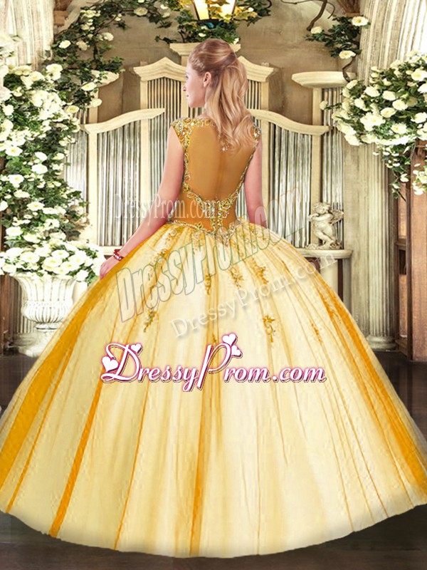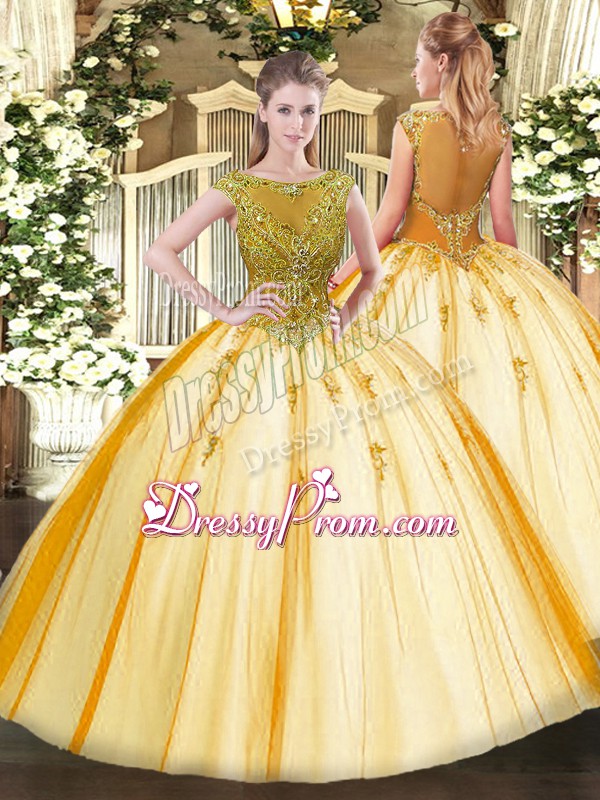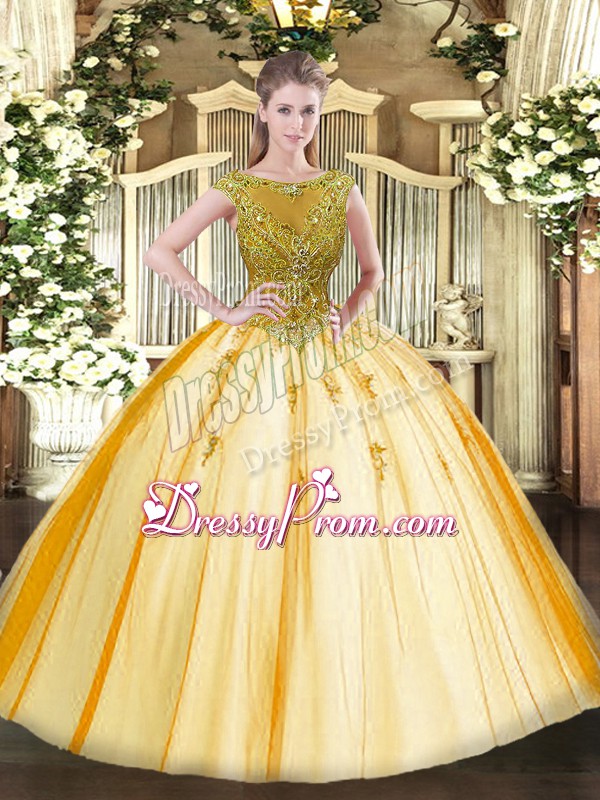 Neckline : ScoopShown Color : GoldSilhouette : Ball GownsSleeve Length : cap sleevesHemline : floor lengthBack Detail : Lace upFabric : TulleEmbellishment : BeadingOccasion : Sweet 16,QuinceaneraSeason : Spring,Summer,Fall,Winter