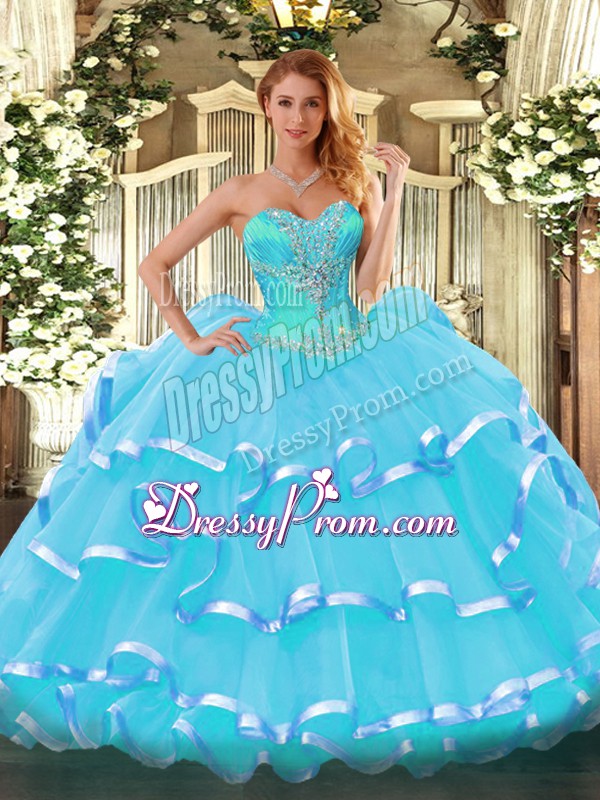 Neckline : SweetheartShown Color : Aqua BlueSilhouette : Ball GownsSleeve Length : sleevelessBack Detail : Lace upFabric : OrganzaEmbellishment : Beading,Ruffled LayersOccasion : Sweet 16,QuinceaneraSeason : Spring,Summer,Fall,Winter