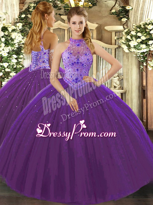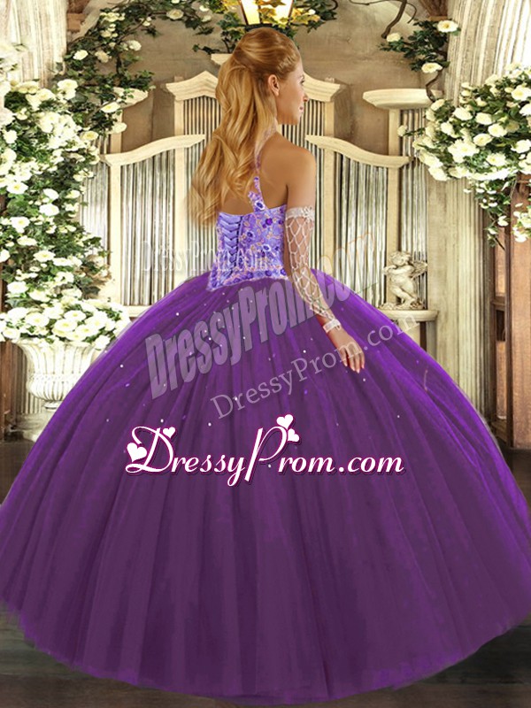 Neckline : Halter topShown Color : PurpleSilhouette : Ball GownsSleeve Length : sleevelessHemline : floor lengthBack Detail : Lace upFabric : TulleEmbellishment : Beading,Appliques,EmbroideryOccasion : Sweet 16,QuinceaneraSeason : Spring,Summer,Fall,Winter