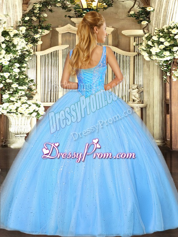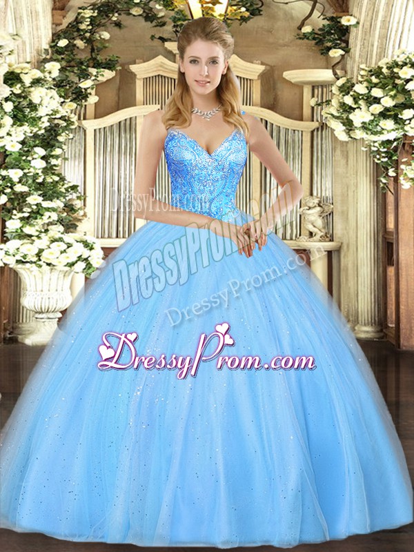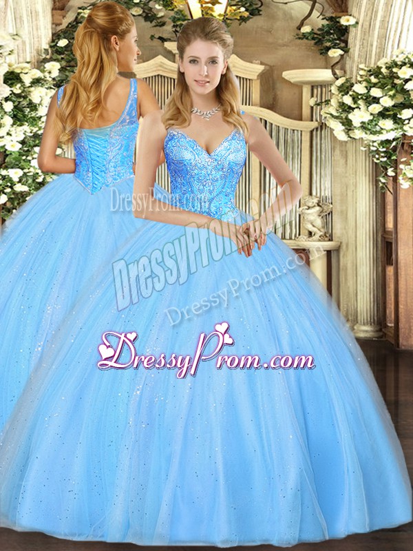 Neckline : V-neckShown Color : Aqua BlueSilhouette : Ball GownsSleeve Length : sleevelessHemline : floor lengthBack Detail : Lace upFabric : TulleEmbellishment : BeadingOccasion : Military Ball,Sweet 16,QuinceaneraSeason : Spring,Summer,Fall,Winter