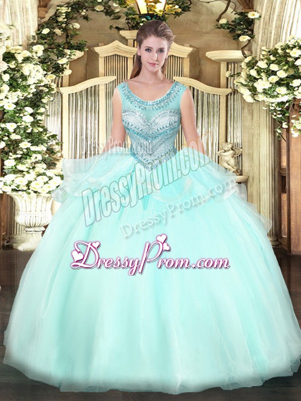 Neckline : ScoopShown Color : Aqua BlueSilhouette : Ball GownsSleeve Length : sleevelessHemline : floor lengthBack Detail : Lace upFabric : OrganzaEmbellishment : BeadingOccasion : Military Ball,Sweet 16,QuinceaneraSeason : Spring,Summer,Fall,Winter