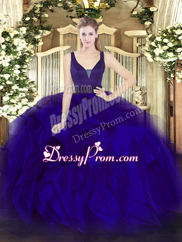 Neckline : StrapsShown Color : BlueSilhouette : Ball GownsSleeve Length : sleevelessHemline : floor lengthBack Detail : ZipperFabric : OrganzaEmbellishment : Beading,RufflesOccasion : Military Ball,Sweet 16,QuinceaneraSeason : Spring,Summer,Fall,Winter