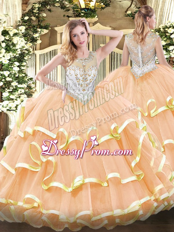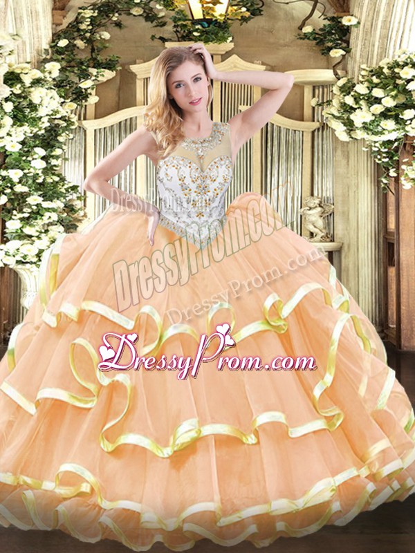 Neckline : ScoopShown Color : PeachSilhouette : Ball GownsSleeve Length : sleevelessHemline : floor lengthBack Detail : ZipperFabric : OrganzaEmbellishment : Beading,Ruffled LayersOccasion : Military Ball,Sweet 16,QuinceaneraSeason : Spring,Summer,Fall,Winter