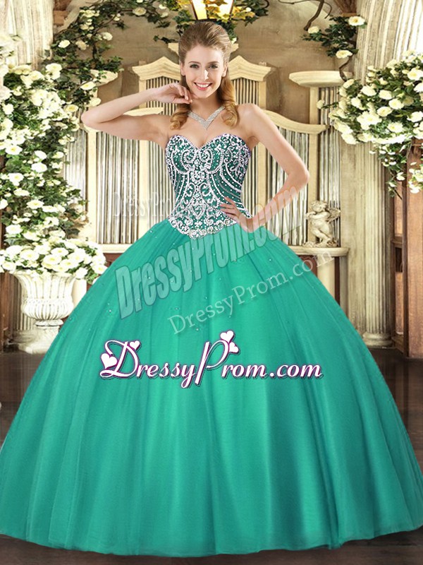 Dazzling Turquoise Tulle Lace Up Sweetheart Sleeveless Floor Length Quinceanera Gowns Beading