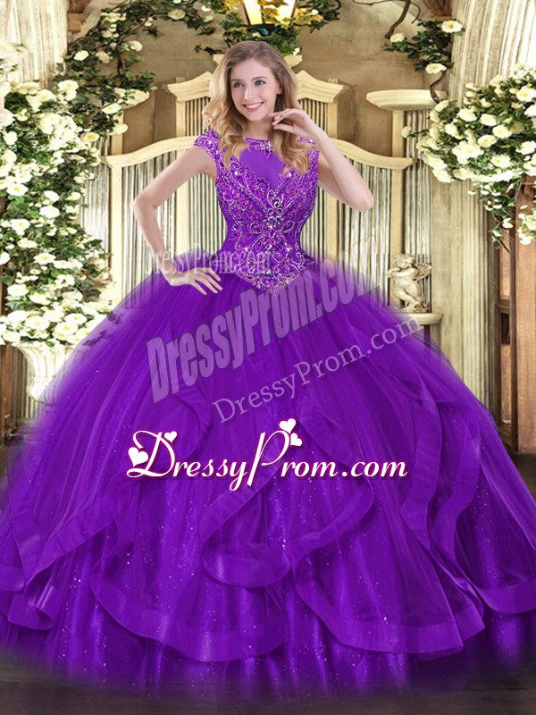 Neckline : ScoopShown Color : PurpleSilhouette : Ball GownsSleeve Length : sleevelessHemline : floor lengthBack Detail : ZipperFabric : TulleEmbellishment : Beading,RufflesOccasion : Sweet 16,QuinceaneraSeason : Spring,Summer,Fall,Winter