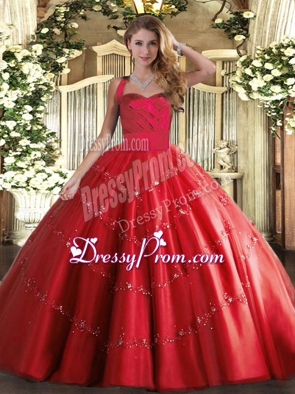 Neckline : Halter topShown Color : RedSilhouette : Ball GownsSleeve Length : sleevelessHemline : floor lengthBack Detail : Lace upFabric : TulleEmbellishment : AppliquesOccasion : Military Ball,Sweet 16,QuinceaneraSeason : Spring,Summer,Fall,Winter
