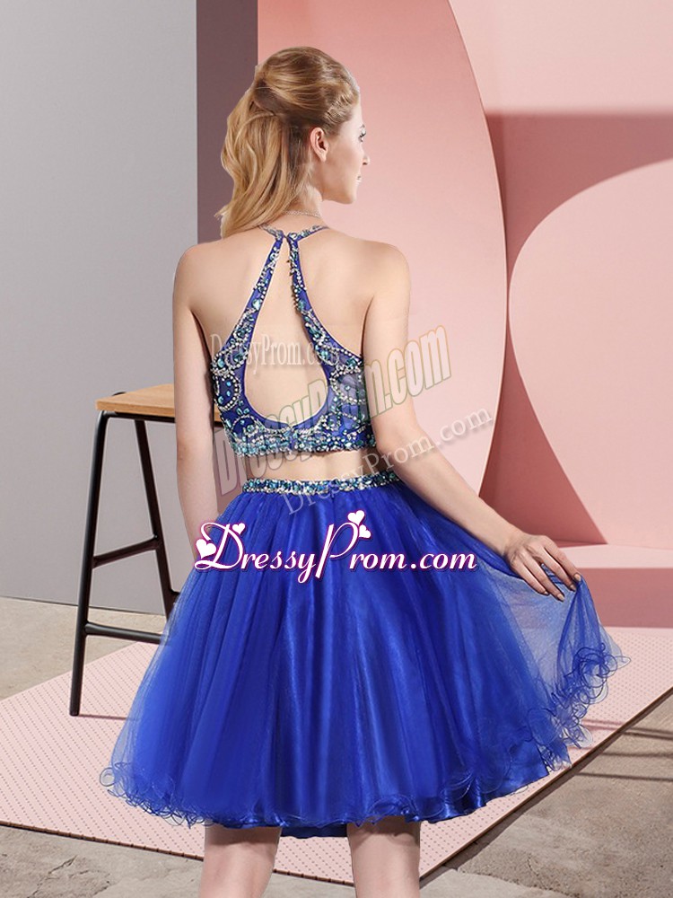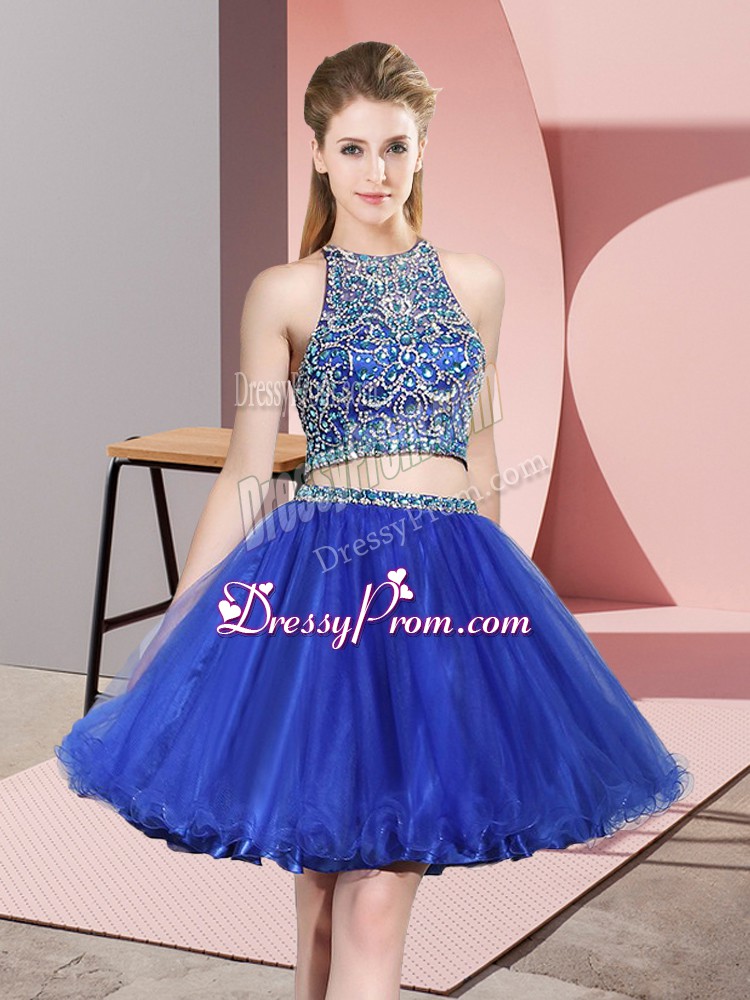 Neckline : ScoopShown Color : BlueSilhouette : Two PiecesSleeve Length : sleevelessHemline : mini lengthBack Detail : Criss crossFabric : TulleEmbellishment : BeadingOccasion : Prom,PartySeason : Spring,Summer,Fall