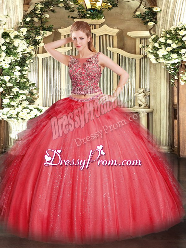 Neckline : ScoopShown Color : Coral RedSilhouette : Two PiecesSleeve Length : sleevelessHemline : floor lengthBack Detail : Lace upFabric : TulleEmbellishment : Beading,RufflesOccasion : Military Ball,Sweet 16,QuinceaneraSeason : Spring,Summer,Fall,Winter