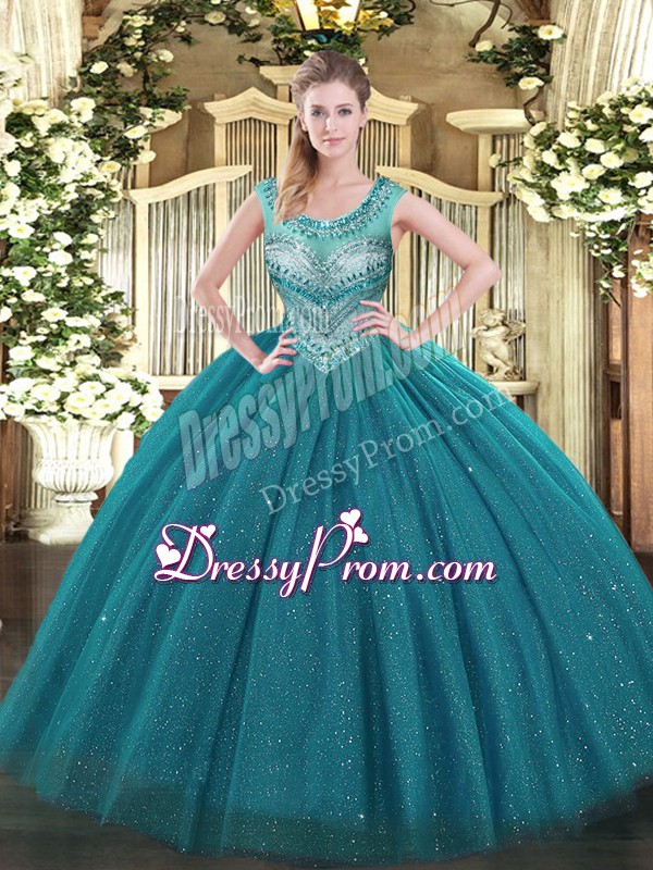 Neckline : ScoopShown Color : Teal Silhouette : Ball GownsSleeve Length : sleevelessHemline : floor lengthBack Detail : Lace upFabric : Tulle,SequinedEmbellishment : BeadingOccasion : Sweet 16,QuinceaneraSeason : Spring,Summer,Fall,Winter