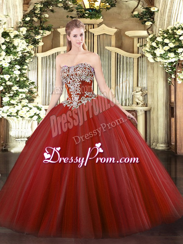 Neckline : StraplessShown Color : Wine RedSilhouette : Ball GownsSleeve Length : sleevelessHemline : floor lengthBack Detail : Lace upFabric : TulleEmbellishment : BeadingOccasion : Military Ball,Sweet 16,QuinceaneraSeason : Spring,Summer,Fall,Winter