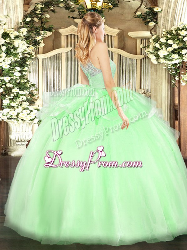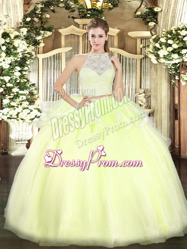Neckline : ScoopShown Color : Yellow GreenSilhouette : Two PiecesSleeve Length : sleevelessHemline : floor lengthBack Detail : ZipperFabric : TulleEmbellishment : LaceOccasion : Military Ball,Sweet 16,QuinceaneraSeason : Spring,Summer,Fall,Winter