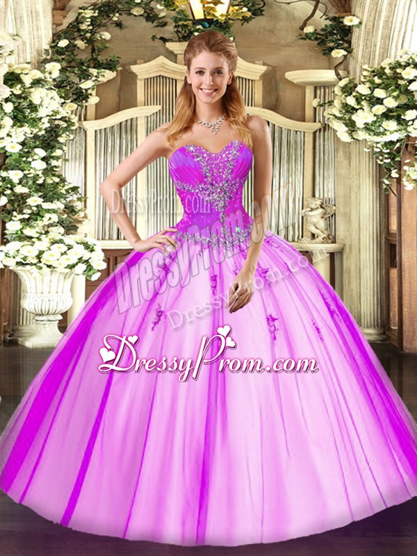 Neckline : SweetheartShown Color : FuchsiaSilhouette : Ball GownsSleeve Length : sleevelessBack Detail : Lace upFabric : TulleEmbellishment : BeadingOccasion : Sweet 16,QuinceaneraSeason : Spring,Summer,Fall,Winter