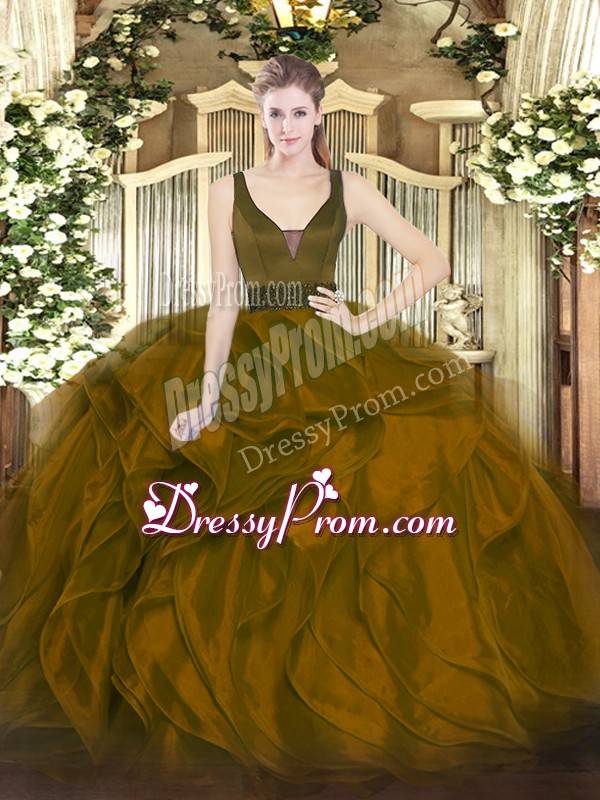 Neckline : StrapsShown Color : BrownSilhouette : Ball GownsSleeve Length : sleevelessHemline : floor lengthBack Detail : ZipperFabric : OrganzaEmbellishment : Beading,RufflesOccasion : Military Ball,Sweet 16,QuinceaneraSeason : Spring,Summer,Fall,Winter