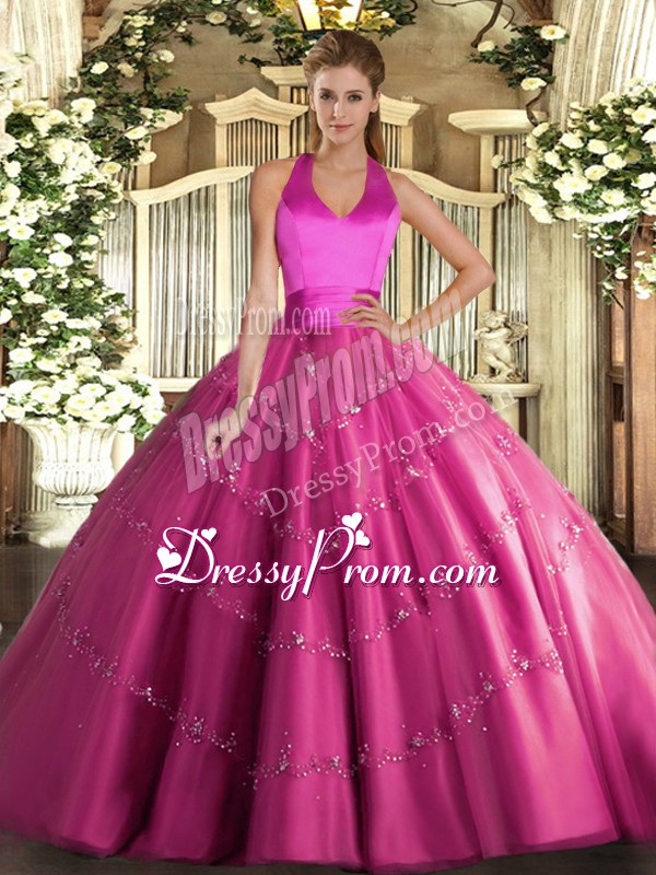 Neckline : Halter topShown Color : Hot PinkSilhouette : Ball GownsSleeve Length : sleevelessHemline : floor lengthBack Detail : Lace upFabric : TulleEmbellishment : AppliquesOccasion : Military Ball,Sweet 16,QuinceaneraSeason : Spring,Summer,Fall,Winter