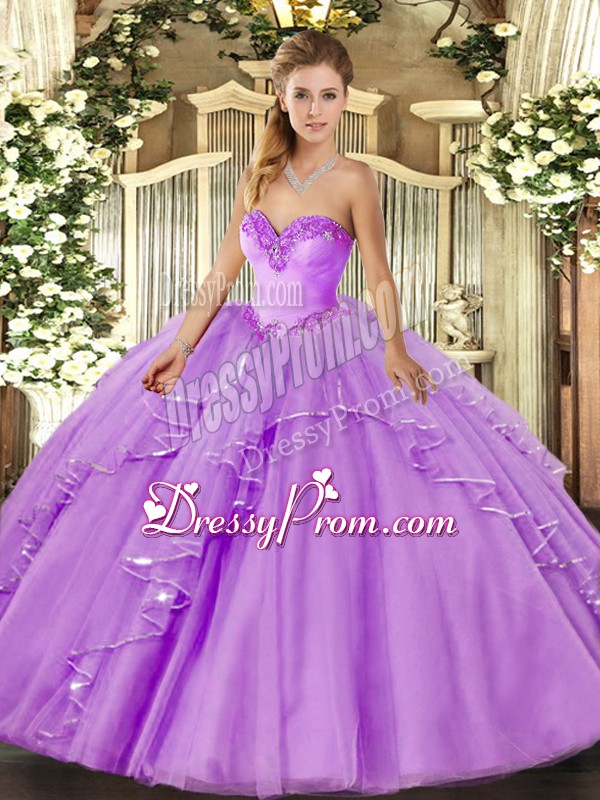 Neckline : SweetheartShown Color : LavenderSilhouette : Ball GownsSleeve Length : sleevelessHemline : floor lengthBack Detail : Lace upFabric : TulleEmbellishment : Beading,RufflesOccasion : Military Ball,Sweet 16,QuinceaneraSeason : Spring,Summer,Fall,Winter