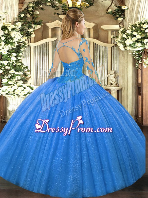 Neckline : ScoopShown Color : Hot PinkSilhouette : Ball GownsSleeve Length : long sleevesHemline : floor lengthBack Detail : Lace upFabric : TulleEmbellishment : LaceOccasion : Military Ball,Sweet 16,QuinceaneraSeason : Spring,Summer,Fall,Winter